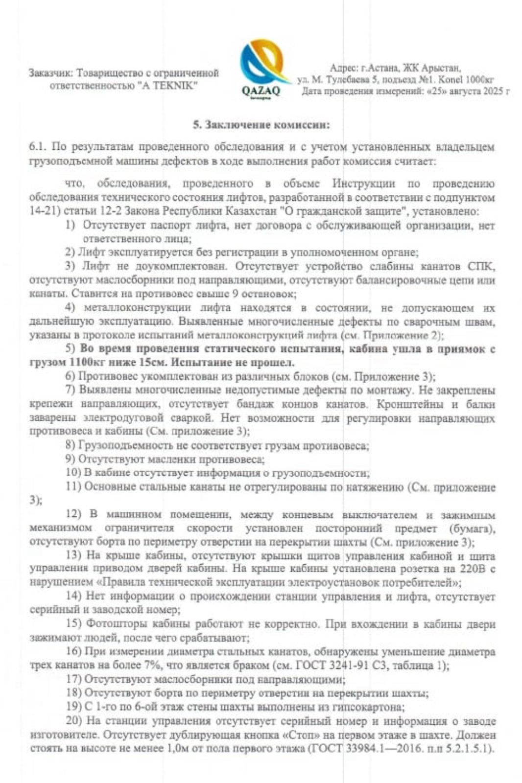 Жильцы также показали экспертное заключение, которое провели еще в августе. В отчете указано, что лифты не имеют паспортов, не зарегистрированы и не прошли статические испытания. Во время тестирования кабина с грузом ушла в приямок – испытание признали проваленным. Среди выявленных нарушений: