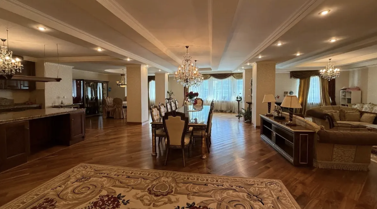 По описанию, квартира выполнена с дорогим ремонтом «для себя»: на полу канадское дерево, входная дверь — бронированная, межкомнатные двери и встроенная кухня — из массива, столешница мраморная.