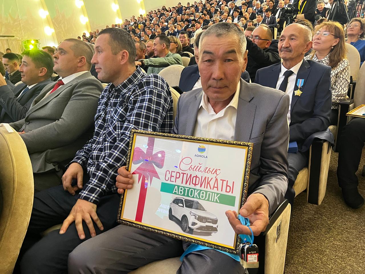 Аким Акмолинской области Марат Ахметжанов вручил участникам торжества государственные награды, сертификаты на миллион тенге и автомобили Kia Sportage.