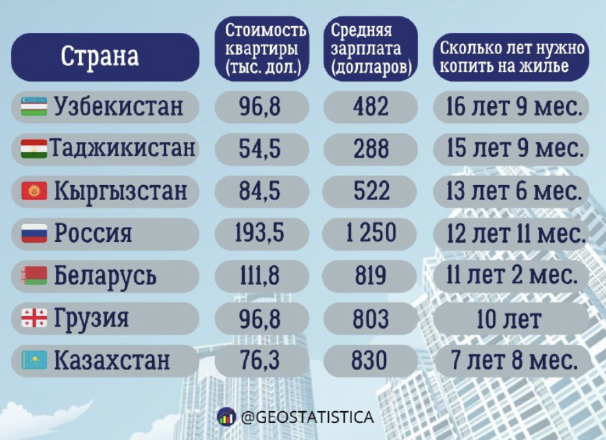 Согласно данным GeoStatistica, Казахстан остаётся страной с самым доступным жильём среди представленных государств региона. Жителям Казахстана требуется в среднем 7 лет 8 месяцев, чтобы накопить на квартиру, тогда как жителям Узбекистана — 16 лет 9 месяцев, что более чем в два раза дольше, передает ИА «NewTimes.kz».