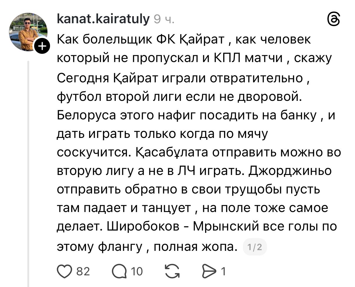 Однако, среди болельщико нашлись и те, кто гооврил о том, что игроки «Кайрата» прилагают очень мало усилий для победы, а кто-то даже уверенно заявил, что у команды нет шансов на победу в Лиге Чемпионов.
