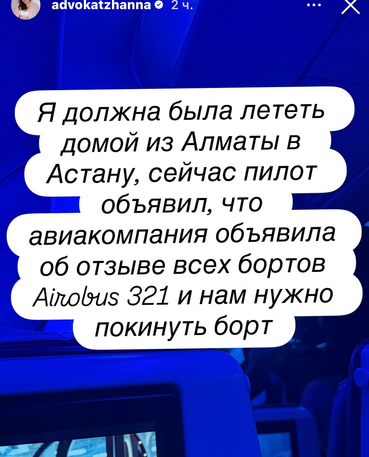 Адвокат Жанна Уразбахова в своём Instagram-stories сообщила, что рейс, на который она собиралась, был задержан: пилот объявил пассажирам, что авиакомпания отзывает все самолёты Airbus A321, и всем необходимо покинуть борт.