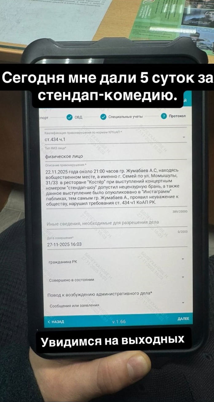 Стендап-комик и организатор мероприятий Алибек Жумабаев, известный как @zhu.standup в Instagram, сообщил о своем аресте на пять суток за выступление в Семее. Позже он уточнил, что в спецприемнике Семея не оказалось свободных мест, и его отпустили домой, передает ИА «NewTimes.kz».