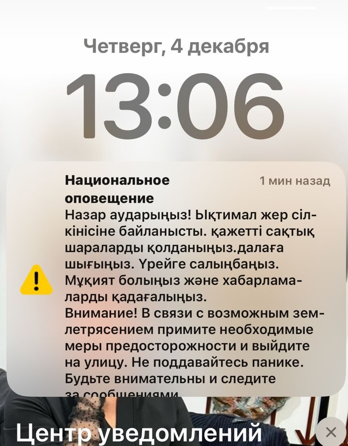 Одна из алматинок предоставила редакции скриншот: ее уведомление поступило лишь в 13:05 — спустя 21 минуту после землетрясения.