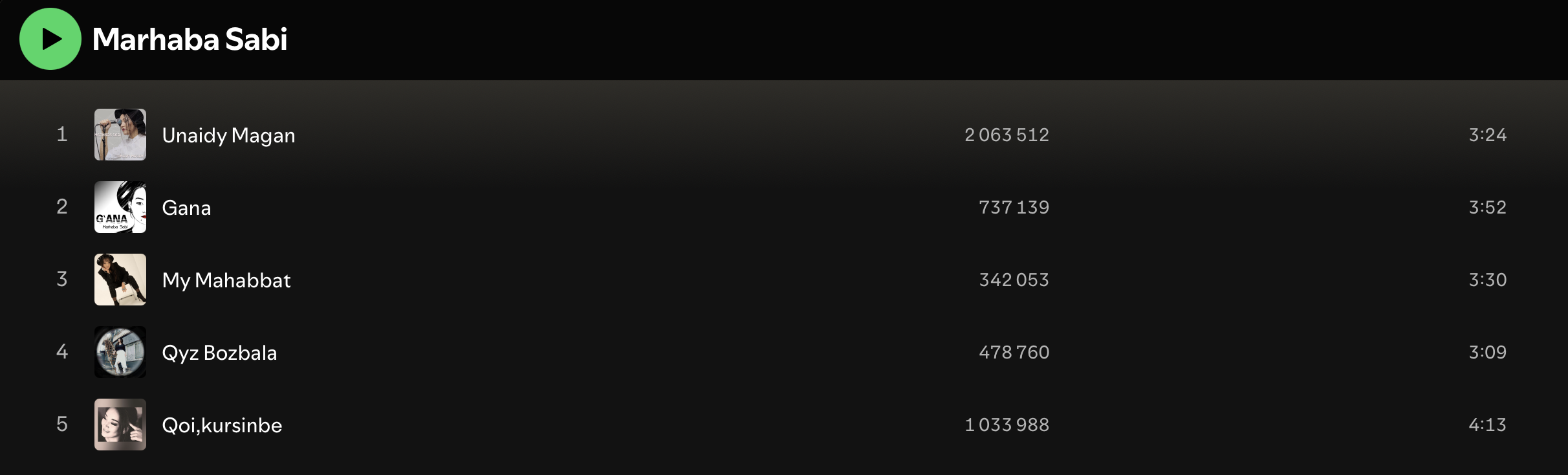 Широкой аудитории Marhaba Sabi известна как автор и исполнительница песен «Ұнайды маған» и «Қой, күрсінбе», а также благодаря каверам «Ғасырлық мұң» — казахскому переводу композиции Батырхана Шукенова «Дождь»— и «Тамшылар» из репертуара группы АБК.