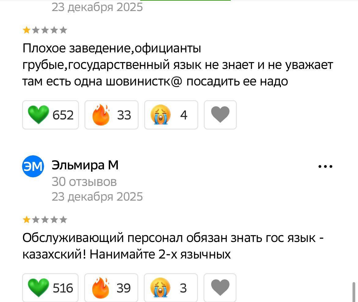 К слову, инцидент уже повлиял и на репутацию самого заведения Gusto. Всего за один день на странице кафе в 2Гис появилось 27 500 комментариев с жалобами на незнание казахского языка сотрудниками и требованиями уволить Елену.