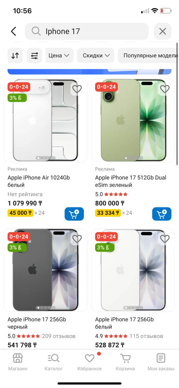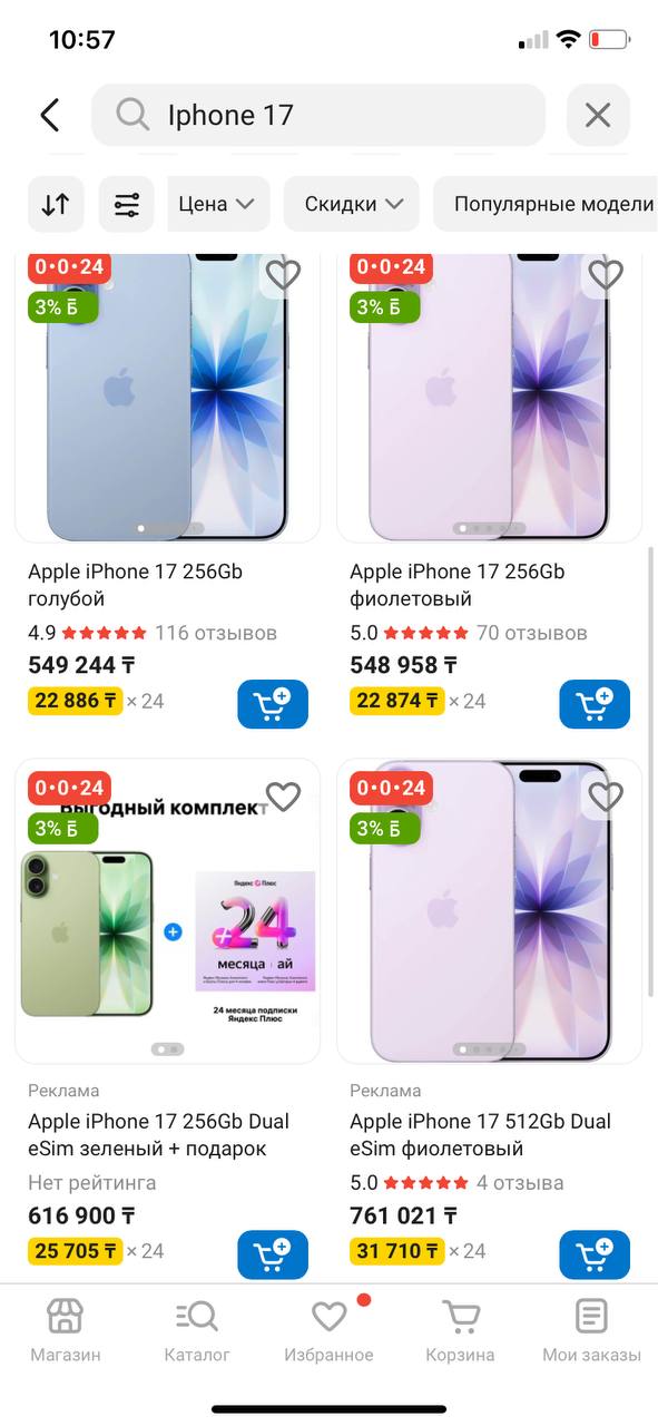 В предновогодней суете цены на iPhone 17 в Казахстане почти не двигаются вниз. Фильтр «скидки от 40%» в маркетплейсах выдает всего пару вариантов, что сразу показывает реальную картину. Большинство моделей держится в привычном диапазоне: 256 ГБ – около 528-550 тысяч тенге, а версии на 512 ГБ поднимаются до 760-800 тысяч, а где-то ценник доходит и до миллиона. Отмеченные как «скидка» предложения чаще дают лишь 3% бонусами, а не реальное снижение цены. У Apple традиционно нет зимних распродаж, и ждать минус 10-20% в декабре не приходится. Если цель – сэкономить, лучше следить за январскими акциями. Если нужен подарок под елку – брать можно, но чудесных скидок перед праздниками не будет.