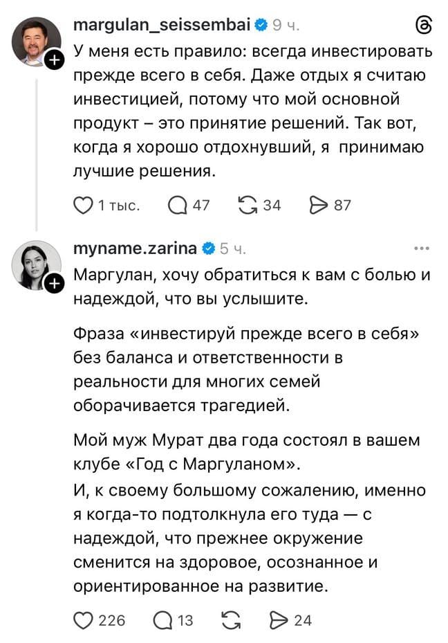 Казахстанка рассказала в Threads, как её муж увлёкся бизнесом и оставил семью после курсов известного казахстанского коуча Маргулана Сейсенбая, передает ИА «NewTimes.kz».