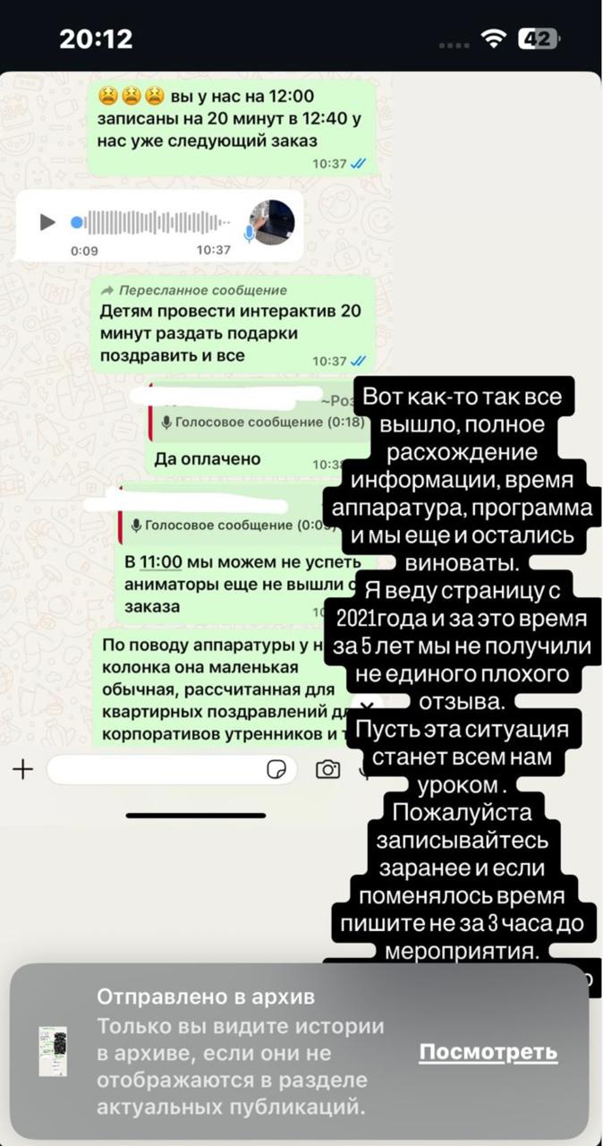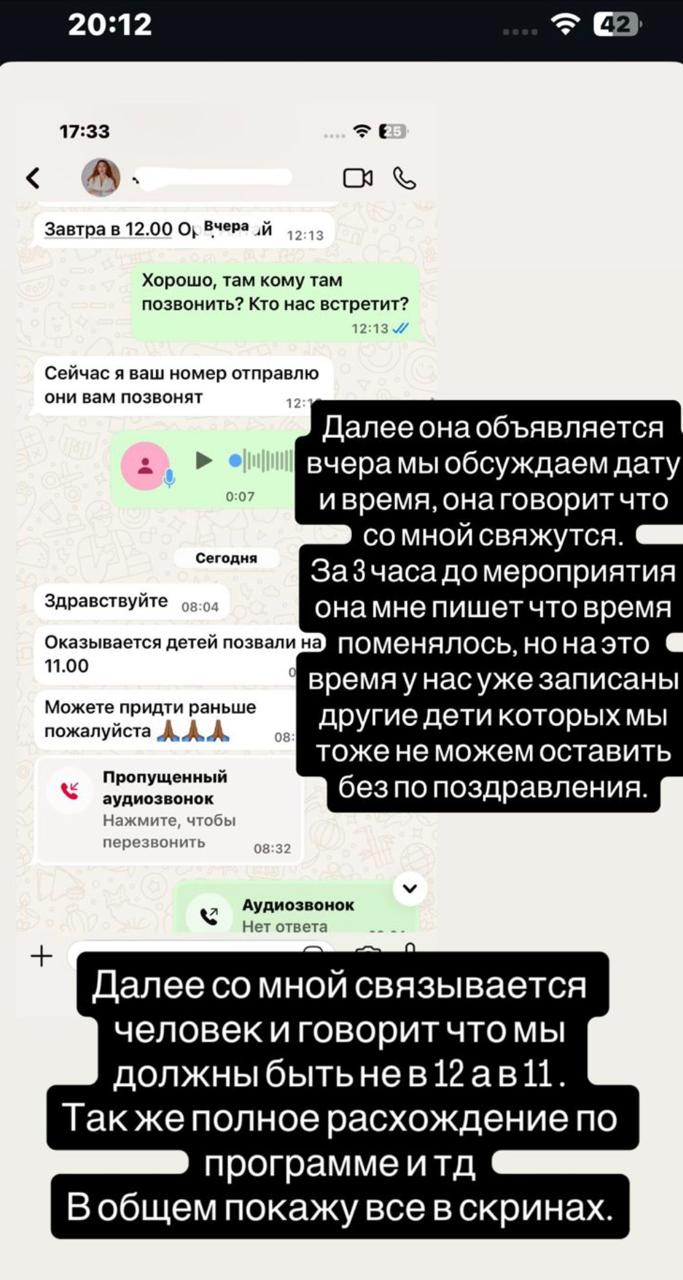 По словам организаторов, они заранее переписывались с Асель, которая изначально указала дату утренника на 12:00 и утвердила программу. Однако позже она перестала выходить на связь. Организаторы отмечают, что почти до самого конца пытались с ней связаться, после чего Асель вновь появилась и изменила время мероприятия.