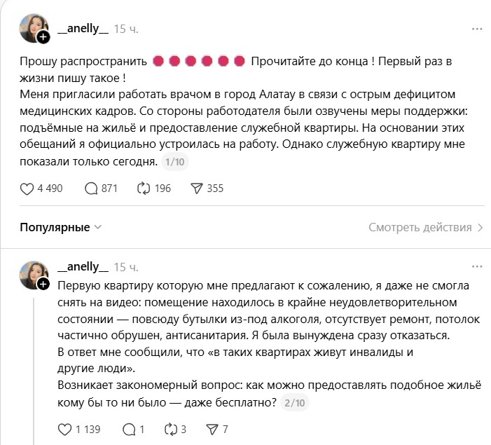 По словам Анель, именно из-за неприемлемых условий медики отказываются переезжать в регионы для работы. В своём посте она обратилась в вышестоящие органы с требованием взять ситуацию под контроль. Девушка также отметила, что ей пообещали выделение средств на приобретение жилья в Алатау, однако условия не были выполнены.