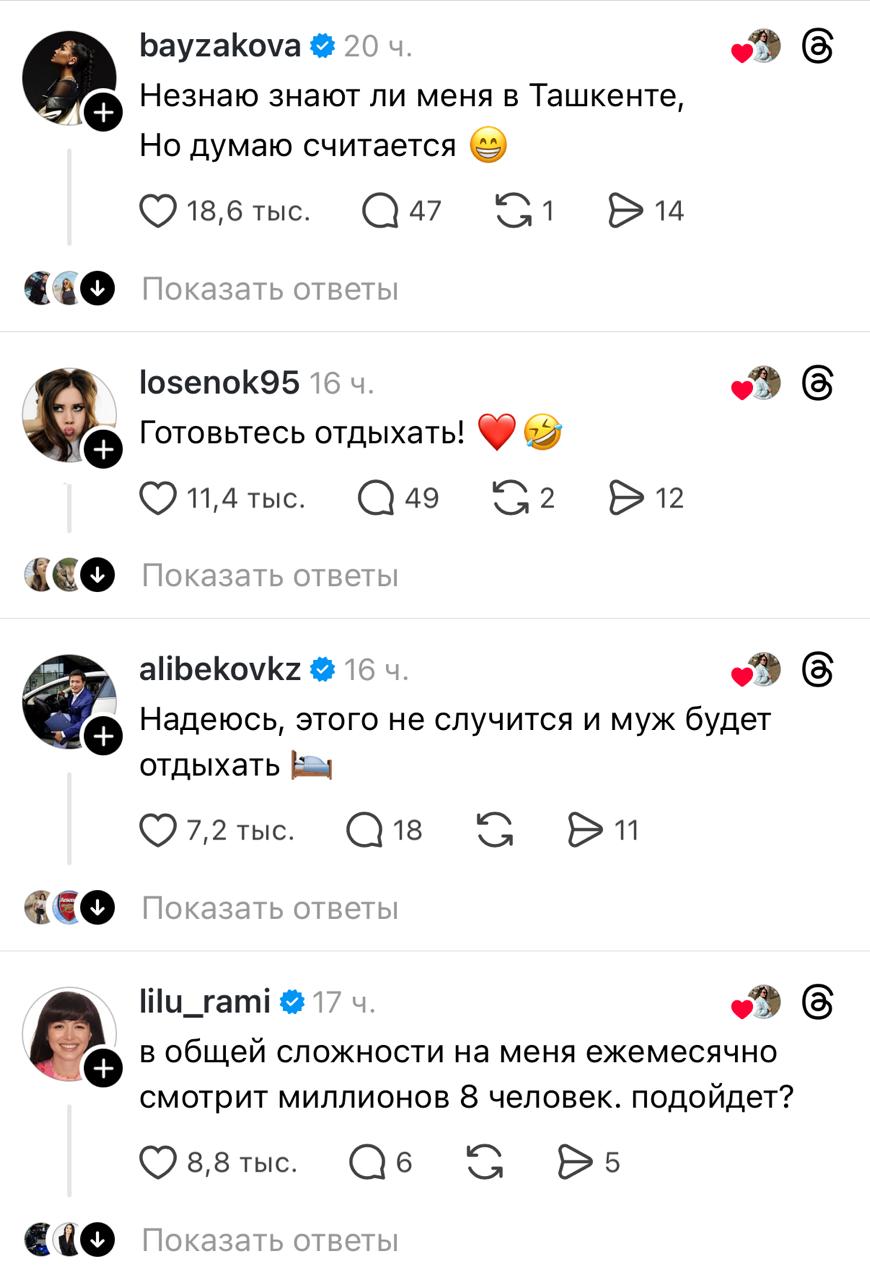 Девушка из Узбекистана Рузана Нубиева взорвала Threads, опубликовав рассказ о споре с мужем из-за уборки и призвала знаменитостей поддержать её. Менее чем за сутки ветка набрала более 700 тысяч просмотров, передает ИА «NewTimes.kz».