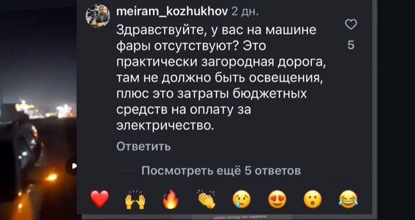 «Здравствуйте, у вас на машине фары отсутствуют? Это практически загородная дорога, там не должно быть освещения, плюс — это затраты бюджетных средств на оплату за электричество», — ответил аким Караганды.