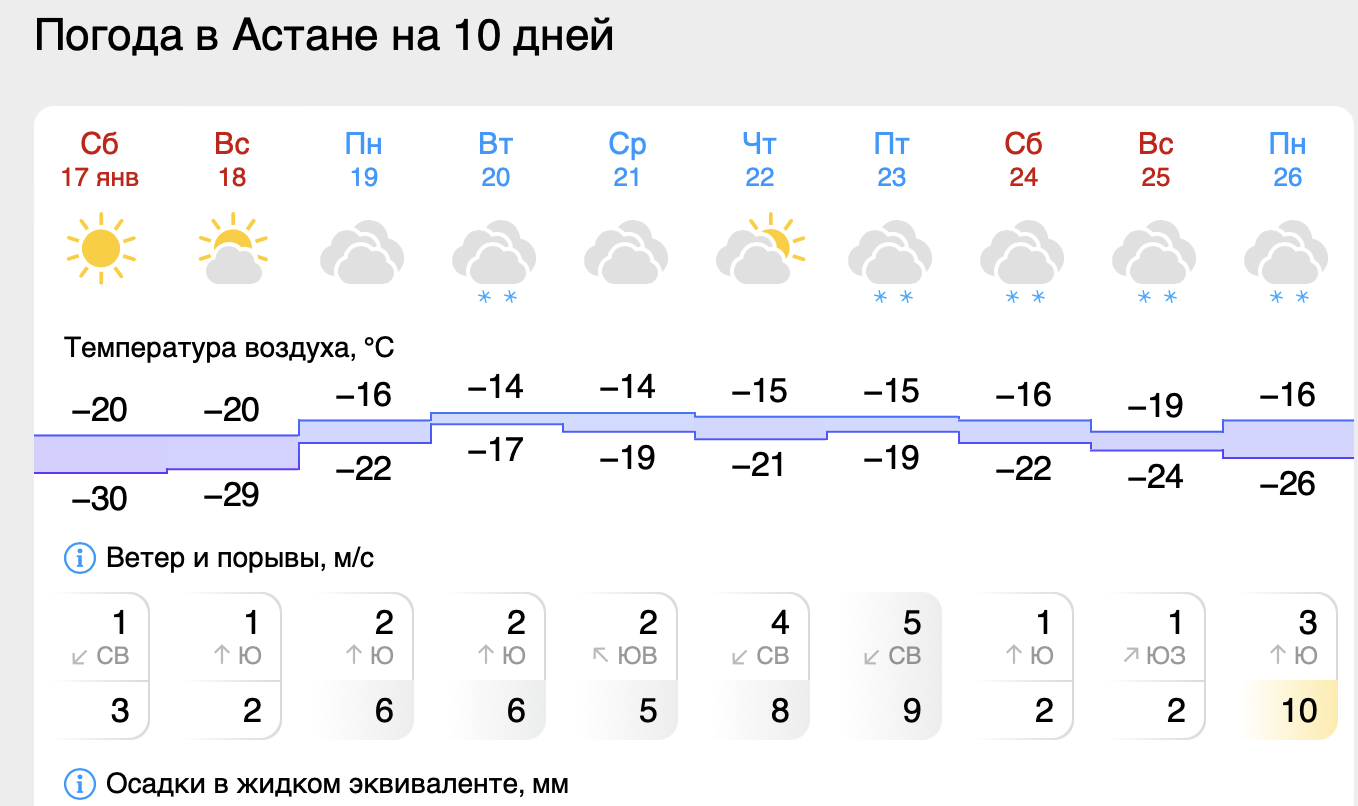 С понедельника, 19 января, морозы начнут постепенно ослабевать. Днём температура повысится до –16 градусов, ночью — до –22. Во вторник и среду, 20 и 21 января, в Астане ожидается –14…–15 градусов днём и до –19…–21 градуса ночью. В эти дни возможен небольшой снег.