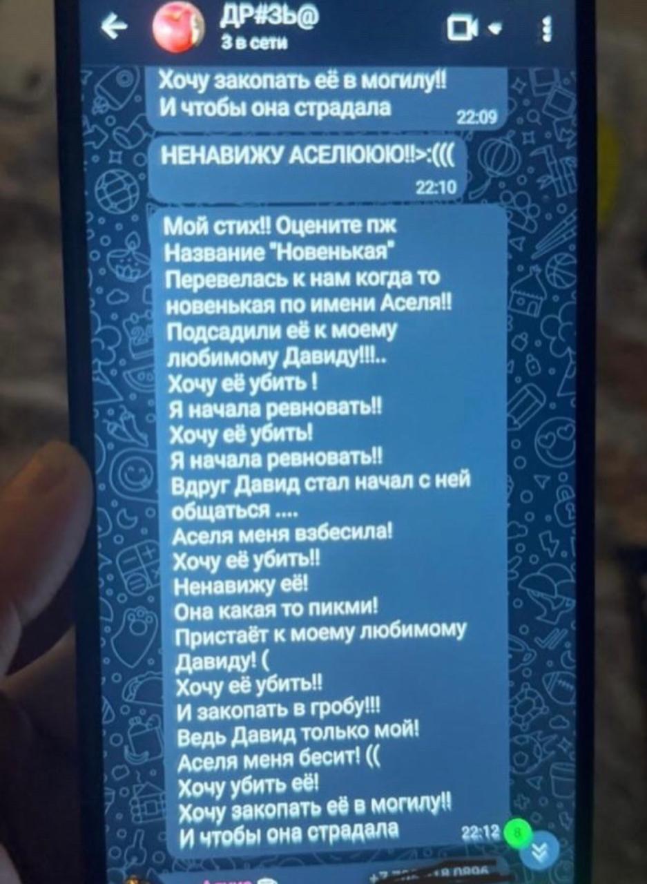 Как сообщила мама Асель, переписку в детском чате случайно обнаружил один из родителей одноклассников. В этих сообщениях, предположительно, обсуждали ее дочь, используя оскорбительные формулировки. В чате присутствовали насмешки, резкие выражения и даже угрозы.