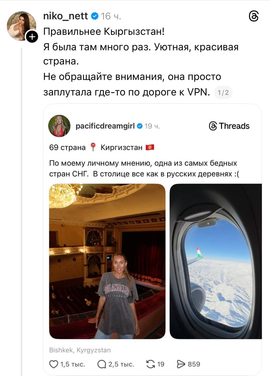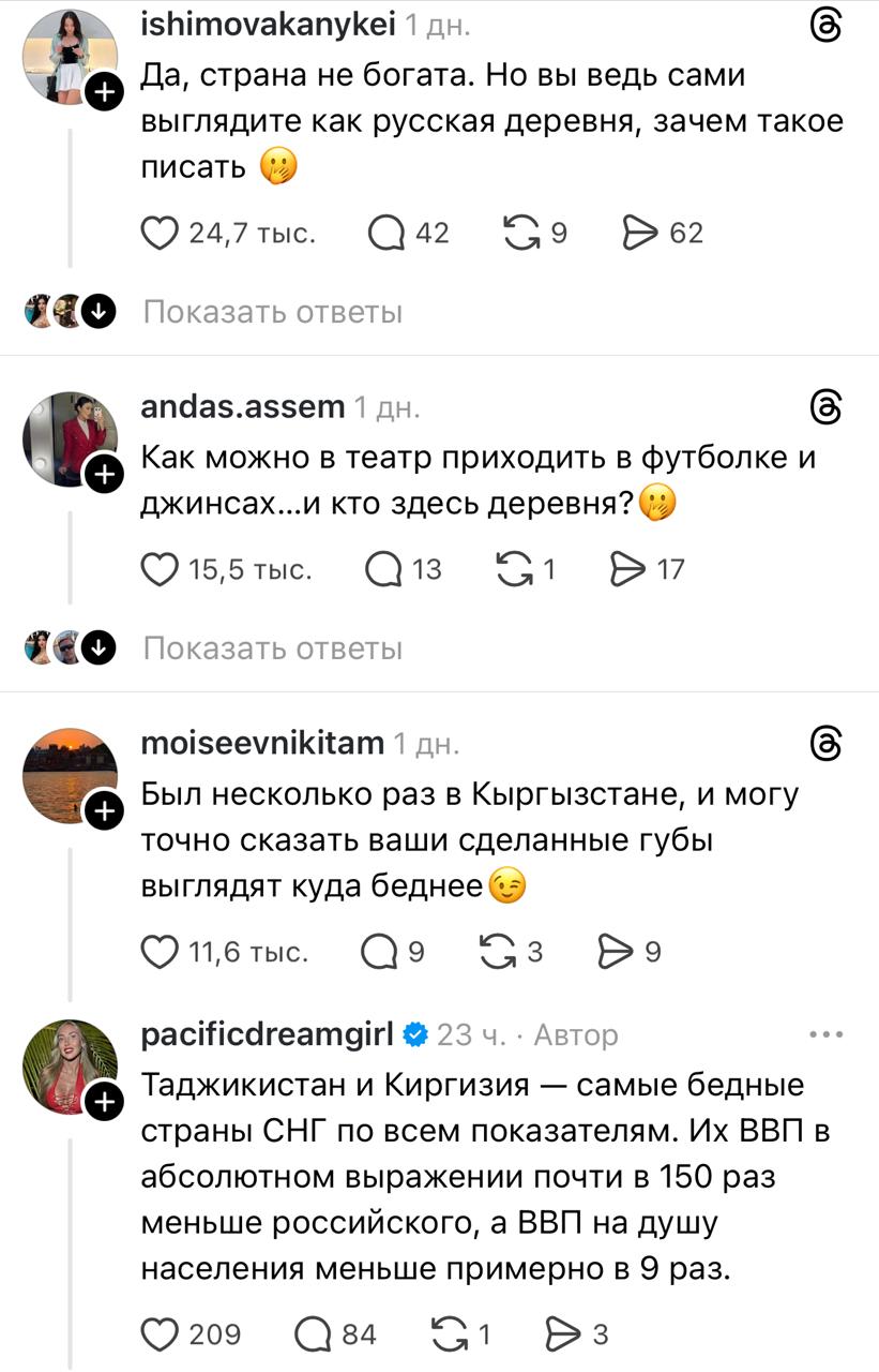 Российская тревел-блогерша Алина Календарёва выложила ветку в Threads, в которой рассказала о том, что недавно посетила Кыргызстан, назвав страну «деревней». В результате она получила волну хейта как со стороны кыргызстанцев, так и со стороны казахстанцев, передает ИА «NewTimes.kz».
