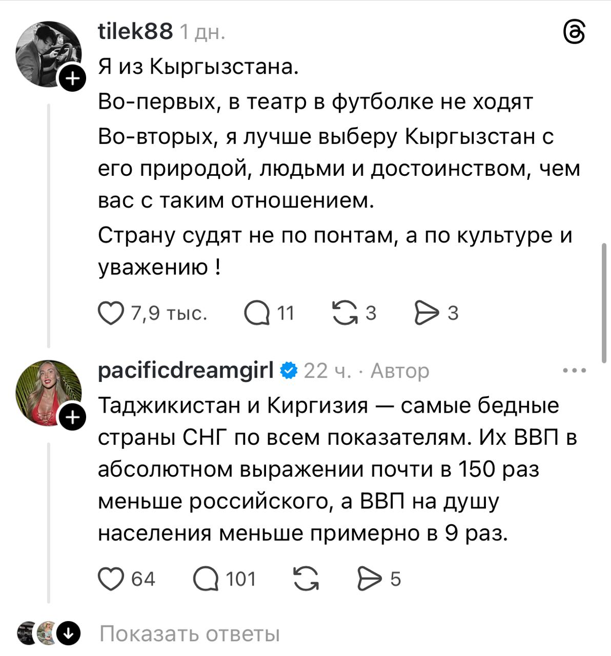 Ветка собрала почти 560 тысяч просмотров и вызвала широкий общественный резонанс. Под публикацией появилось большое количество возмущенных комментариев. Одной из самых заметных реакций стал ответ казахстанского блогера, который в отдельной ветке открыто заступился за кыргызский народ.