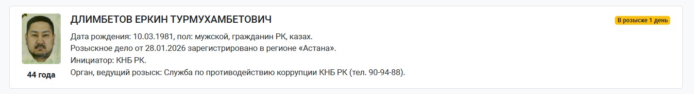 Согласно данным реестра, розыскное дело зарегистрировано 28 января 2026 года в Астане. Инициатором розыска выступил Комитет национальной безопасности.