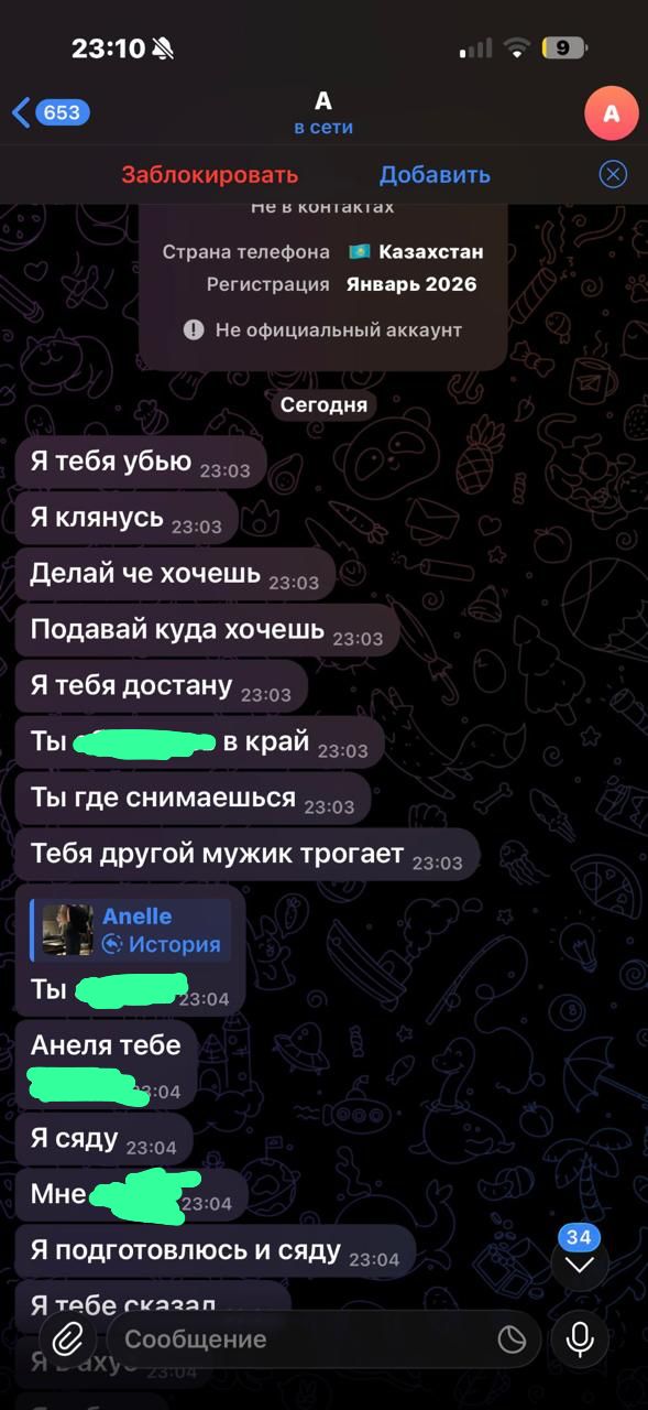 Анеля также заявляет, что может быть не единственной пострадавшей. По её словам, с ней связалась ещё одна девушка, которая сообщила, что с ноября 2025 года подвергалась преследованию со стороны того же мужчины, несмотря на многочисленные блокировки.