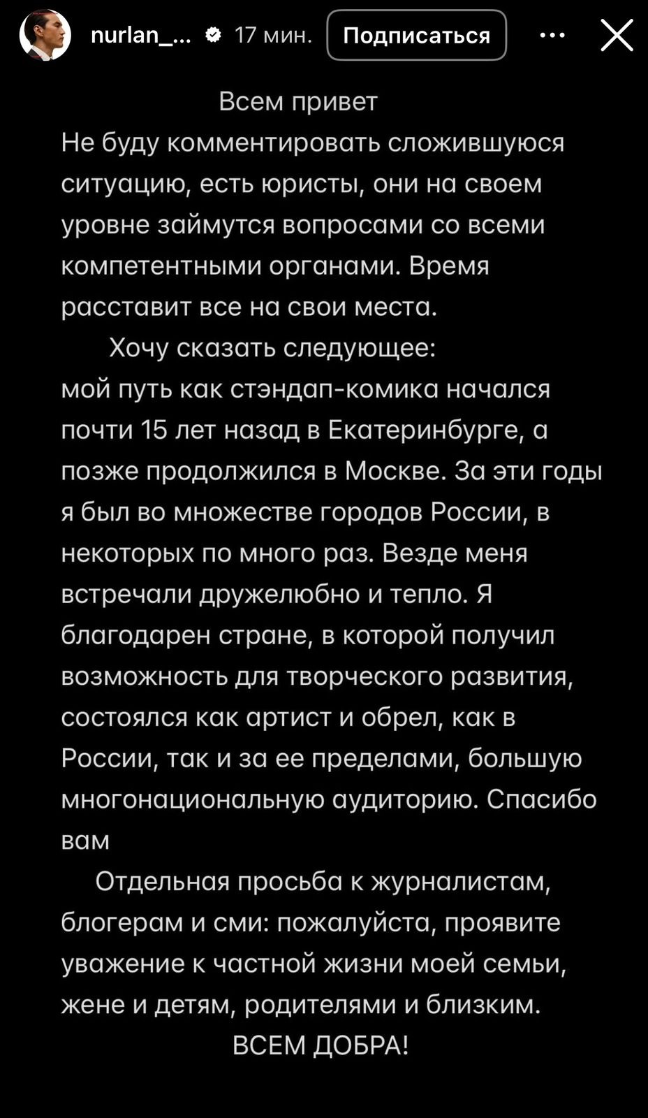 Комик Нурлан Сабуров сделал первое публичное заявление после депортации из России. В своём обращении артист отметил, что благодарен стране за возможность творческого развития и профессионального становления, подчеркнув при этом, что не будет комментировать саму ситуацию и что всеми юридическими вопросами занимаются его представители., передаёт ИА «NewTimes.kz»..