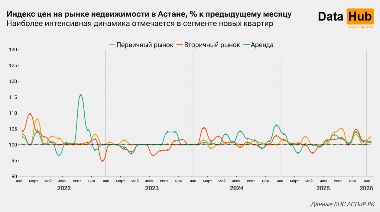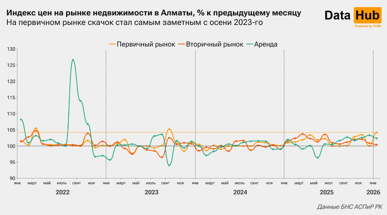 В Астана ситуация спокойнее. Первичное жилье подорожало на 2,3% по сравнению с декабрем. На вторичке рост составил 1%, аренда прибавила 0,7%. Динамика выглядит умеренной, хотя в предыдущие месяцы фиксировали и более быстрые скачки.