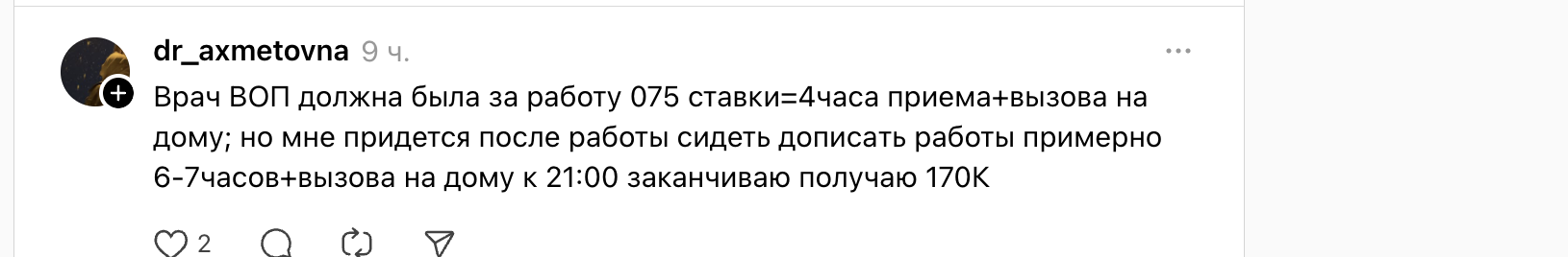 «Врач-дерматовенеролог в круглосуточном стационаре. 1,5 ставки + 6–7 дежурств — вышло 409 000. Это с 8:00 до 17:30, потом остаёшься на ночь, утром снова работаешь до вечера. “Даму” виснет, эксперт выявляет дефекты, пациенты дерутся, истории болезни забираешь домой. А дома дети, которые скучают по маме»,- написал один из них.