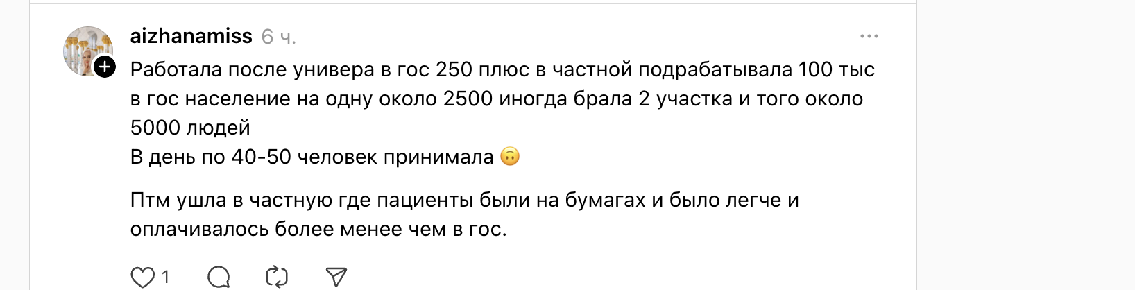 «Детский гастроэнтеролог, 127 тысяч (0,5 ставки), госполиклиника, Павлодар. Плюс 30% в частной»,