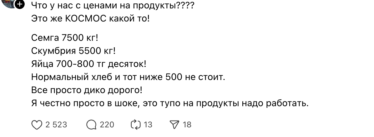«Жесть, что происходит с ценами в Казахстане?! Почти все продукты подорожали на треть, а то и на половину»,