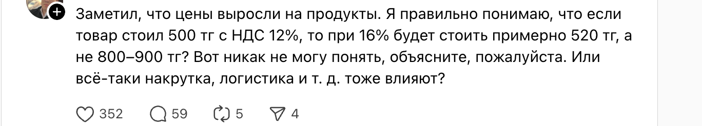 «В Астане за полпакета еды платят около 50 тысяч тенге, а семья из пяти человек тратит от 350 тысяч в месяц даже при экономии. Объясните простыми словами, что сейчас происходит с производством и поставками продуктов, почему цены так растут? Это из-за повышения НДС? И ждать ли дальнейшего подорожания?» — спросили вице-министра.