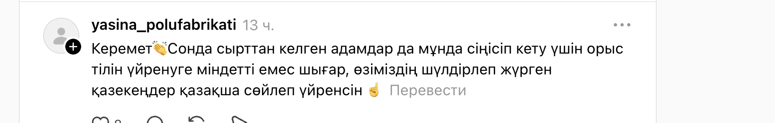 «Это очень актуальная проблема. Я тоже часто замечаю: говорю на казахском – мне отвечают по-русски. При этом любят говорить, что русский язык равен казахскому. Но если казахский не используется, о каком равенстве может идти речь? Если есть равенство, тогда нужно обслуживать на обоих языках», – написал пользователь.