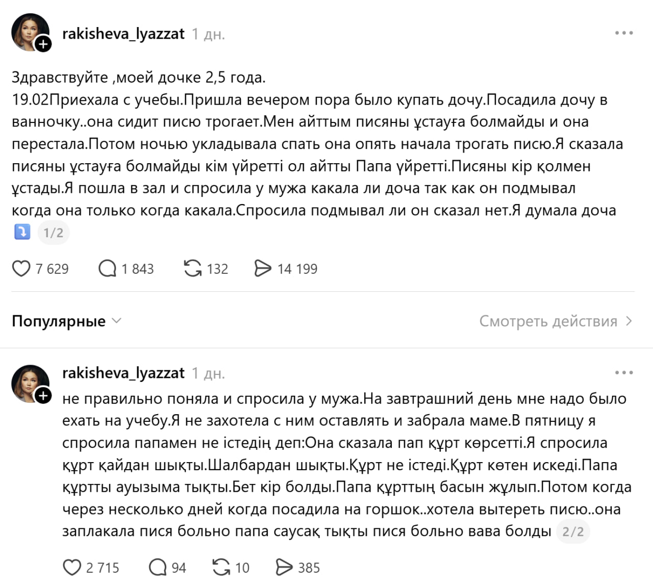 Девочка пыталась описать происходящее доступным ей языком. О том, какие именно ужасы, по словам ребенка, были совершены над ней, можно узнать из скриншотов публикации Ляззат Ракишевой.