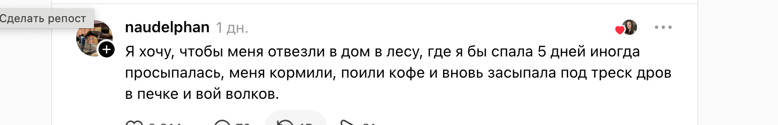 Я хочу, чтобы меня отвезли в дом в лесу, где я могла бы провести несколько дней в полном покое. Спать столько, сколько нужно, иногда просыпаться, когда меня мягко будят – чтобы накормить, напоить кофе, укрыть тёплым пледом. Лежать в мягкой постели, медленно просыпаться, гулять по лесу среди тишины и свежего воздуха. Чтобы мне готовили завтрак, вокруг не было шума, интернета и новостей – только тишина, спокойствие и природа. Несколько дней такого уединения, чтобы восстановиться, наполниться силами и вернуться к жизни с новой энергией.