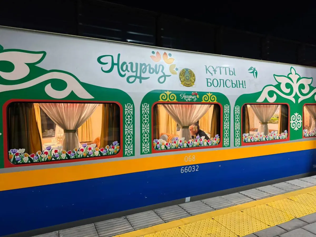 Как сообщает пресс-служба КТЖ, пассажиров встречали на перроне проводники в традиционной национальной одежде. Каждого пассажира угощали национальными блюдами — наурыз-коже и баурсаками.