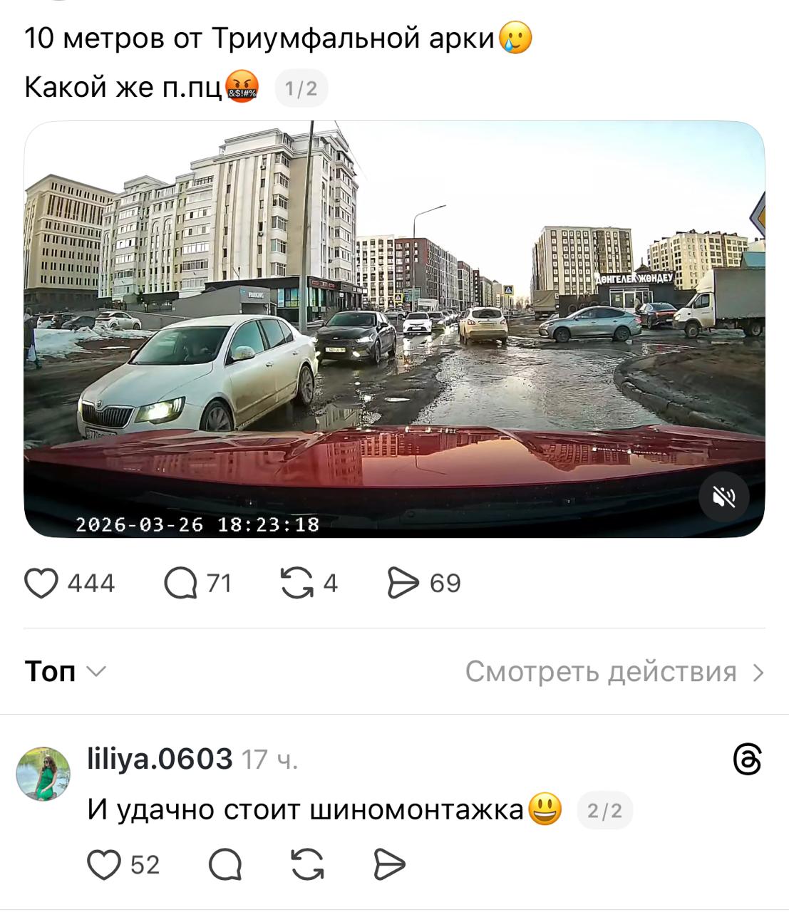 Роликом поделилась жительница Астаны в Threads, возмутившись тем, что дороги в таком состоянии находятся в самом центре столицы. На кадрах с видеорегистратора видно, что проезжая часть буквально усеяна ямами, залита лужами и грязью. Автор иронично отмечает, что неподалёку расположена шиномонтажная мастерская – как раз на случай ремонта автомобилей после поездки по таким дорогам.