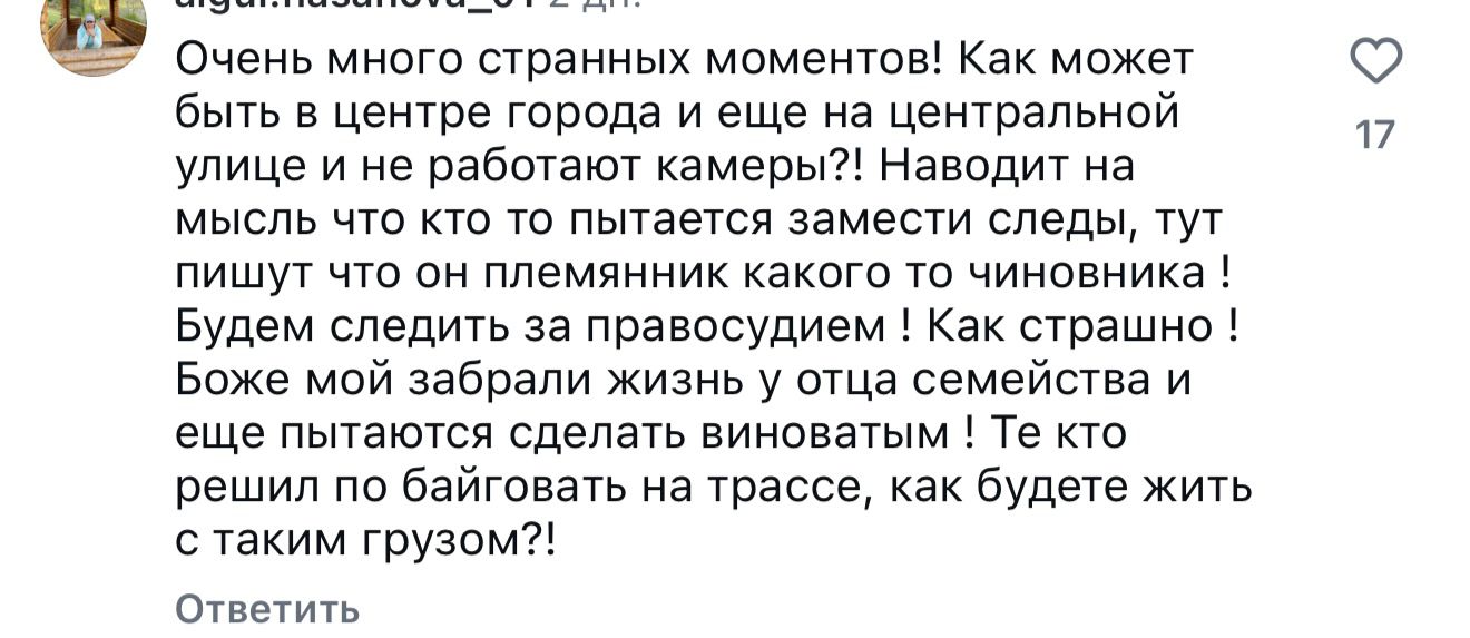 «Человек, который решил, что может ехать 200 км/ч и распоряжаться чужими жизнями. Из-за его безответственности погиб отец шестерых детей. Единственный кормилец и опекун двоих детей. Мы потеряли близкого человека, а он до сих пор на свободе. Удар был настолько серьезным, что тело расчленило, голова отделилась от тела и лежала вдоль дороги, а он решил просто скрыться», – написала родственница погибшего.