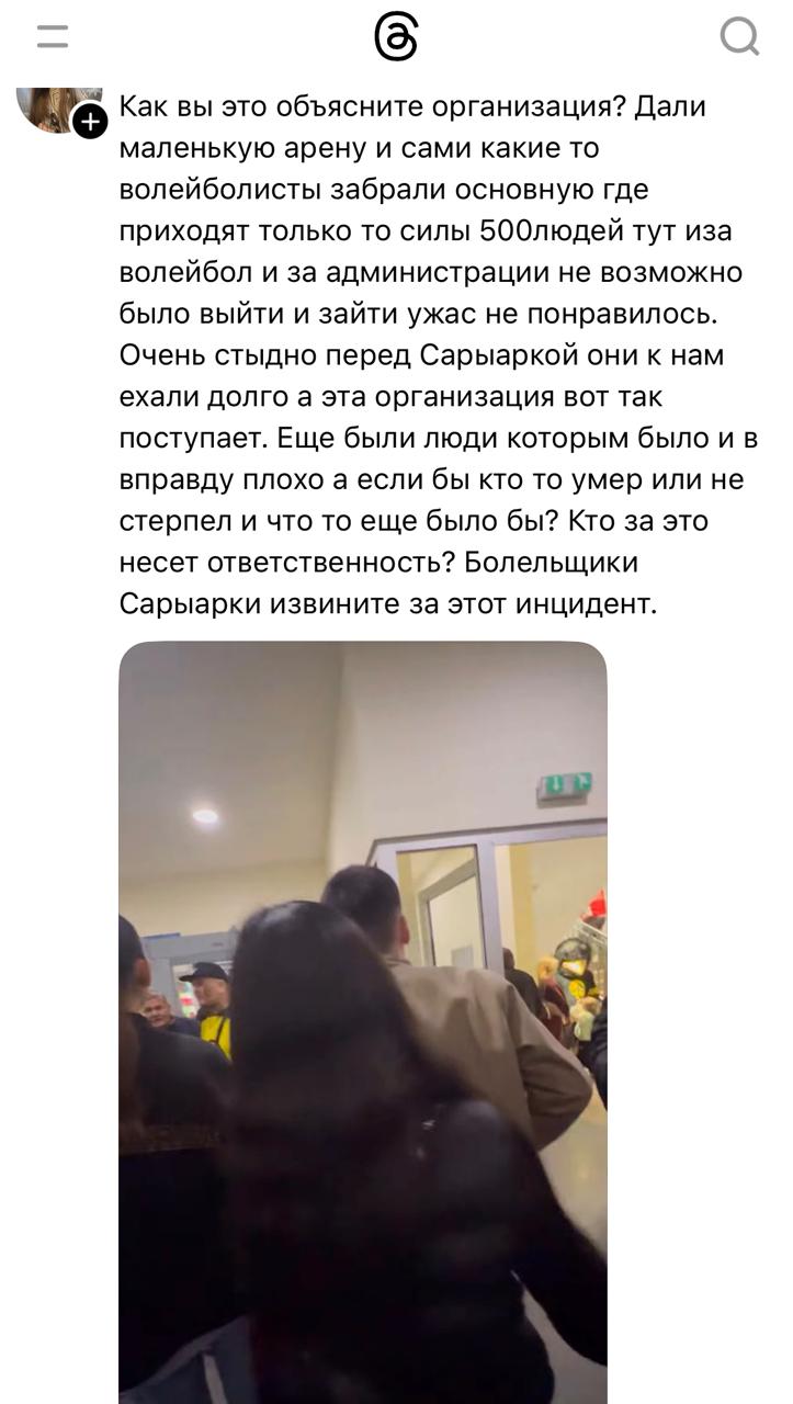 Казахстанцы публикуют посты в Threads с жалобами на организацию финала чемпионата Казахстана по хоккею. По их словам, многих болельщиков не пустили на матч из-за нехватки мест, а те, кому всё же удалось попасть внутрь, были вынуждены смотреть игру стоя.