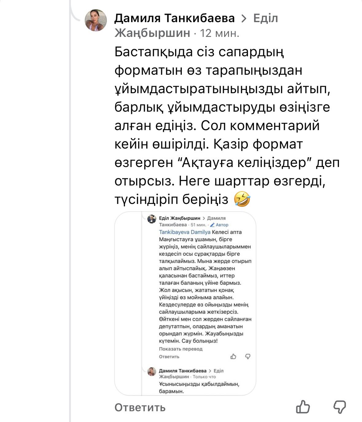 Позже Танкибаева заявила, что комментарий с первоначальными условиями исчез, а формат встречи изменился. Теперь, по её словам, речь идёт о поездке в Актау: