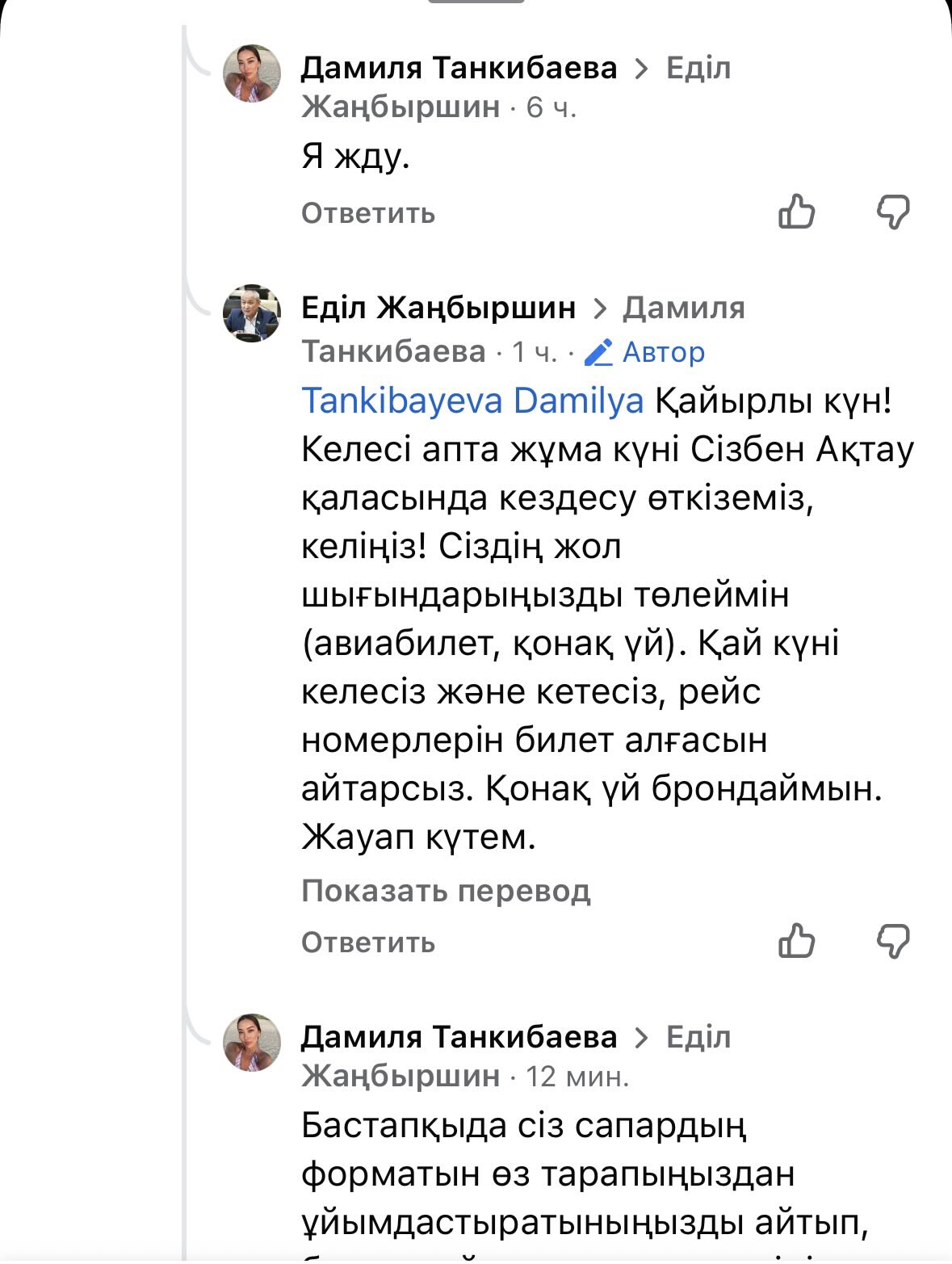 «На следующей неделе в пятницу проведём встречу с вами в Актау, приходите, ваши расходы оплачу (авиабилет, гостиница). Скажите, когда прилетаете и улетаете, чтобы купить билеты. Гостиницу забронирую. Жду ответа».