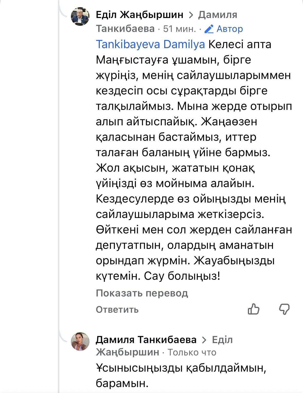 «На следующей неделе лечу в Мангистау. Поехали вместе, встретимся с моими избирателями и обсудим эти вопросы. Здесь в комментариях спорить не будем. Начнём с Жанаозена, поедем к семье ребёнка, которого загрызли собаки. Я беру на себя дорогу и проживание. Вы сможете донести свою позицию до моих избирателей. Я депутат от этого региона и выполняю их запрос. Жду вашего ответа», — написал Жанбыршин.