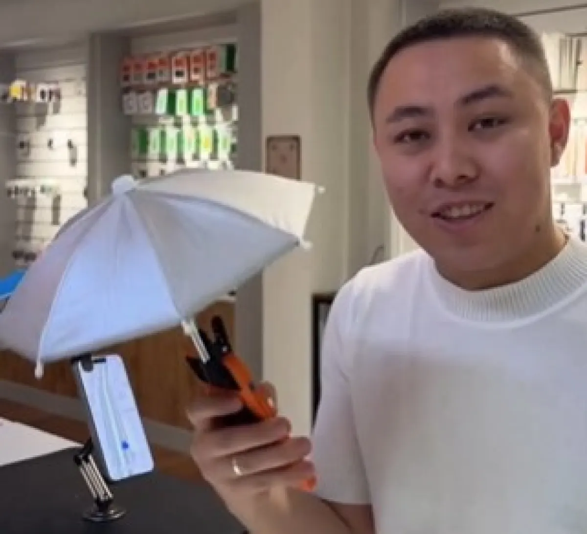 «Если вы спросите, для чего они нужны: когда вы пользуетесь телефоном в машине, например, работая в такси, на него попадают прямые солнечные лучи. Чтобы солнце не светило и телефон не перегревался, у нас есть такие зонты».