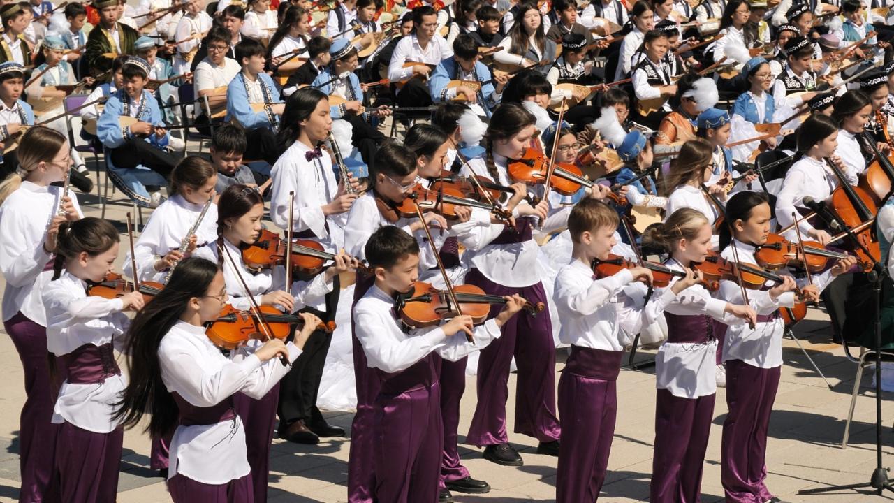 Школьники играли на национальных и классических инструментах, таких как домбра, кобыз, кыл-кобыз, жетыген, саз сырнай, флейта и скрипка.