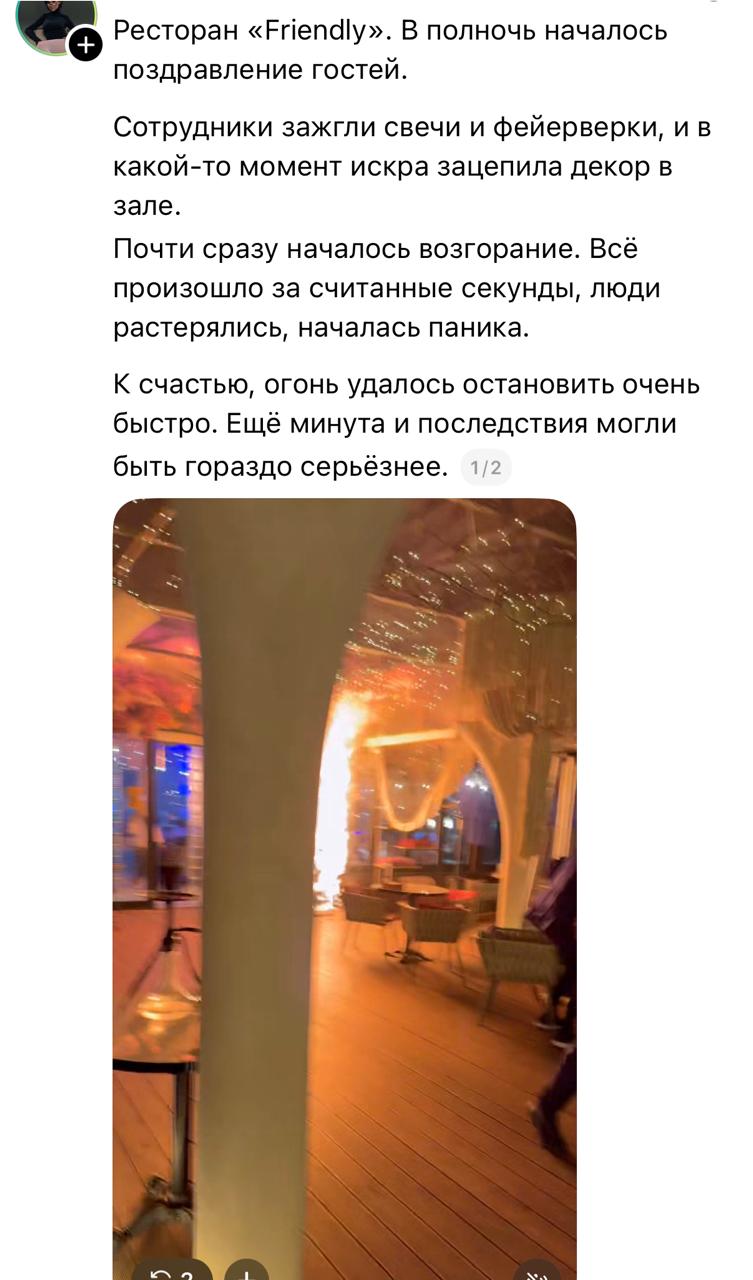 Одна из посетительниц выложила в Threads видео и рассказала, что всё случилось буквально за секунды, люди растерялись, началась паника. К счастью, огонь удалось быстро потушить. По её словам, ещё минута и последствия могли бы быть намного серьёзнее.