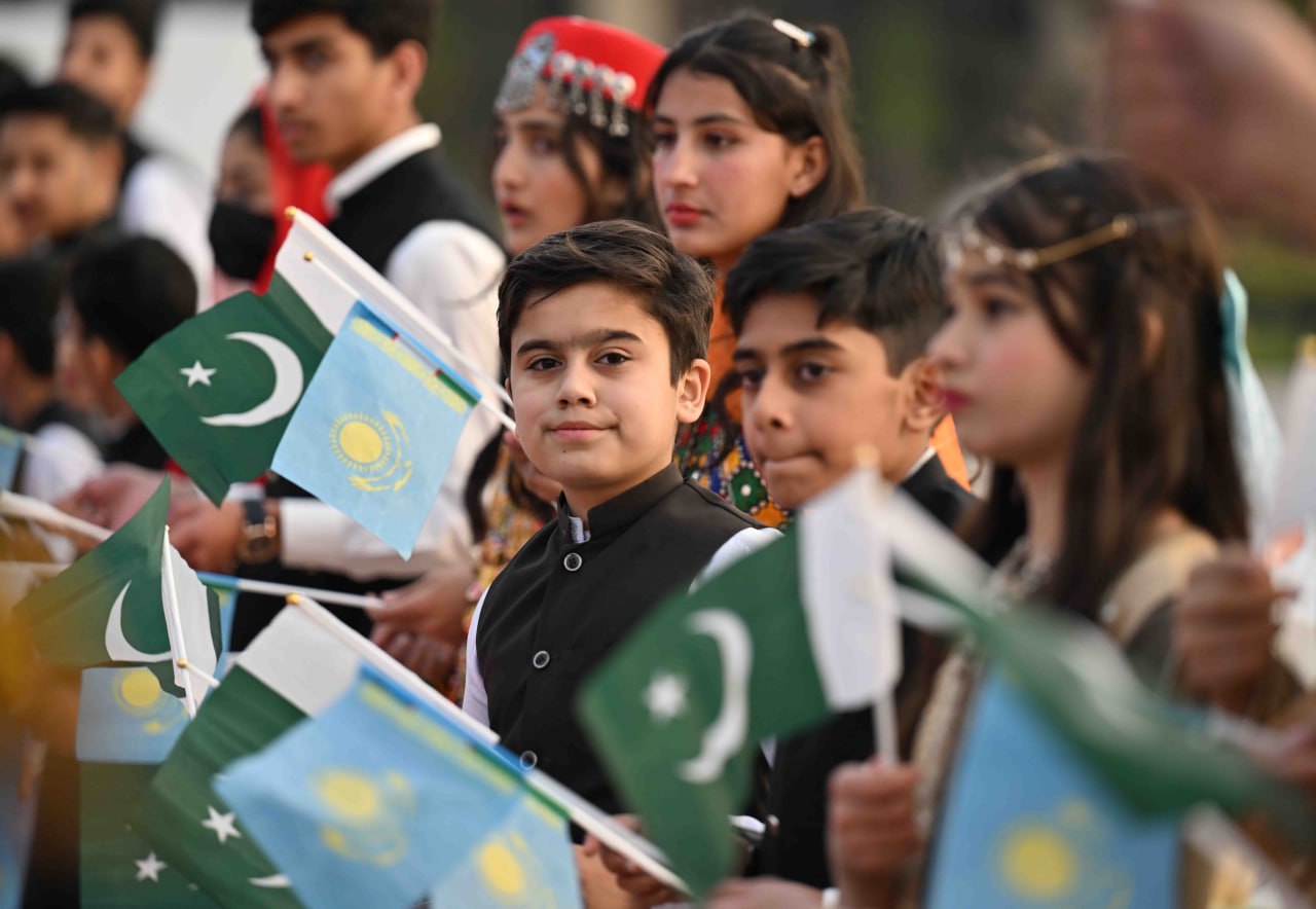 Касым-Жомарта Токаева также приветствовала группа детей с флагами Казахстана и Пакистана.