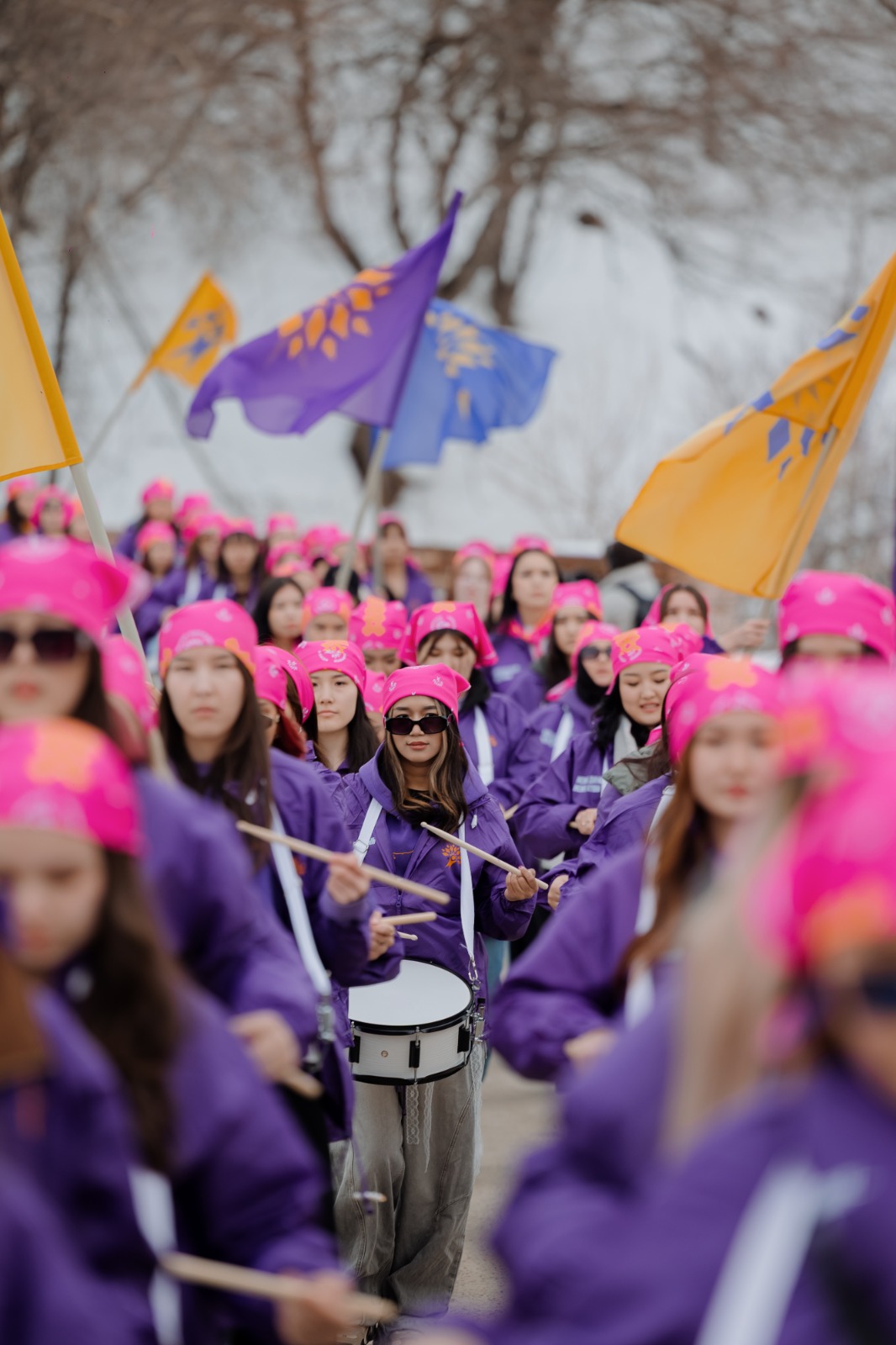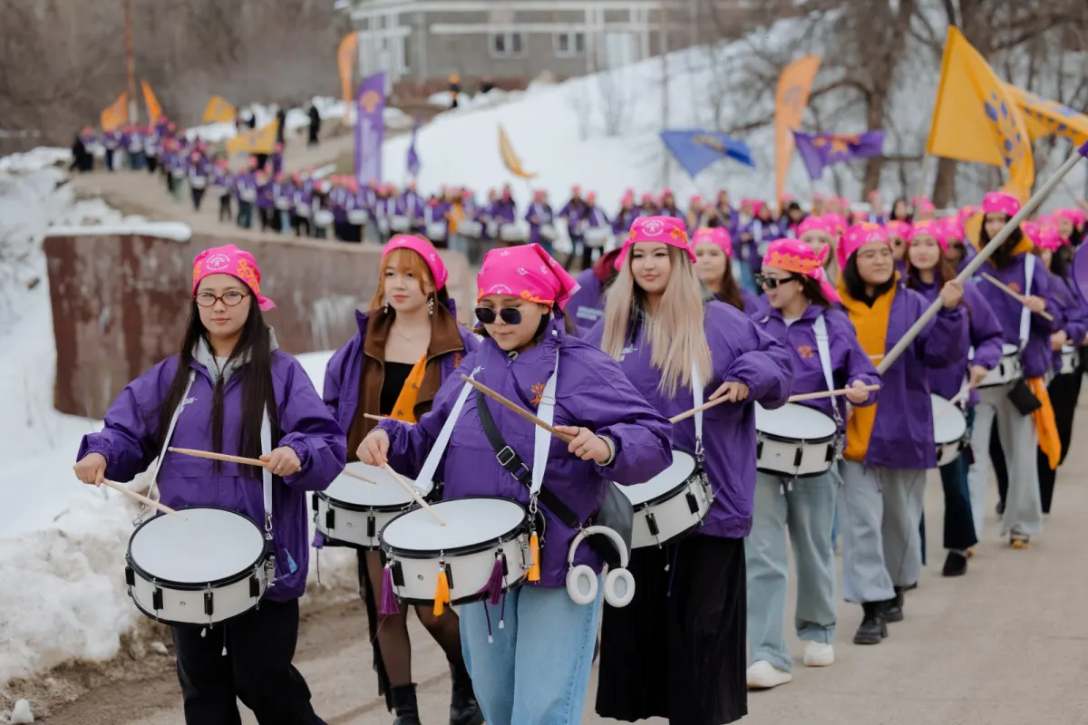 Ритм барабанов сопровождал шествие и стал визуальным и звуковым акцентом акции, призывая казахстанцев проявлять гражданскую активность и принять участие в референдуме по обновлённой Конституции, который состоится 15 марта.