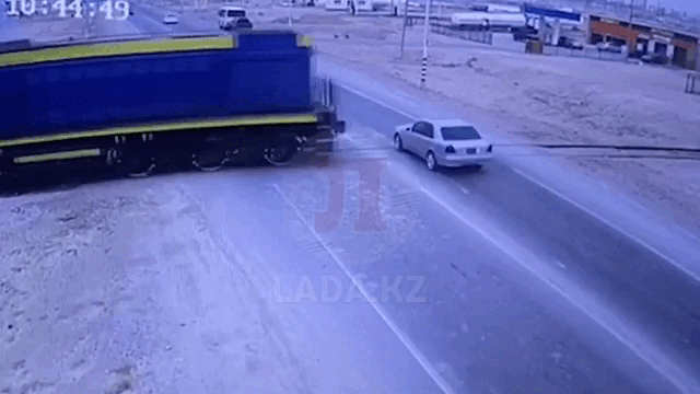 Момент столкновения иномарки с тепловозом в Жанаозене зафиксировала камера наружного наблюдения, передает lada.kz.