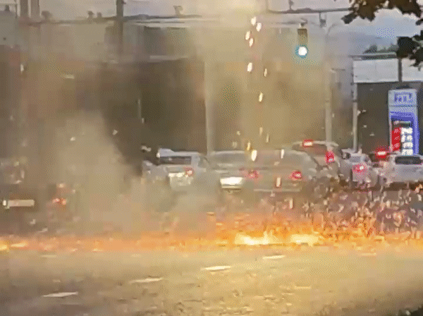 На кадрах видно, что произошло замыкание проводов, предназначенных для передачи электроэнергии троллейбусам. В результате этого началось возгорание, искры падали прямо на проезжающие мимо автомобили.