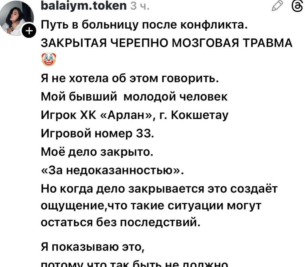 Жительница Кокшетау выступила с публичным заявлением о насилии со стороны игрока местного хоккейного клуба «Арлан». В своих соцсетях она разместила снимки с гематомами и ссадинами на лице и теле, а также сообщила о закрытии уголовного дела.